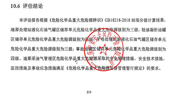 迪那處理站液化石油氣罐區危險化學品重大危險源級別為三級;輕油凝析油罐區危險化學品重大危險源級別為四級;牙哈處理站新液化石油氣罐區危險化學品重大危險源級別為三級;事故油罐區危險化學品重大危險源級別為四級。 |